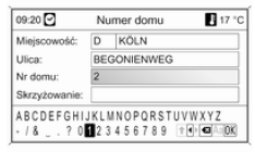 nazwy ulicy lub numery domów: Obrócić pokrętło MENU, aby zaznaczyć żądany znak.