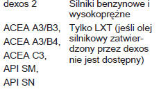 Jeśli olej zgodny z parametrami dexos nie jest dostępny, należy używać odpowiednich zastępczych olejów silnikowych: Jeśli olej zgodny z parametrami dexos nie jest dostępny podczas wymiany oleju lub w celu zapewnienia odpowiedniego poziomu oleju, można użyć zastępczego oleju silnikowego o powyższych parametrach. Jednakże używanie oleju niezgodnego z parametrami dexos może w niektórych sytuacjach prowadzić do obniżenia wydajności lub uszkodzenia silnika.