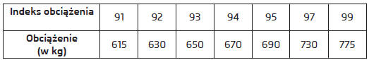Indeks obciążenia wskazuje maksymalne dopuszczalne obciążenie jednej opony.