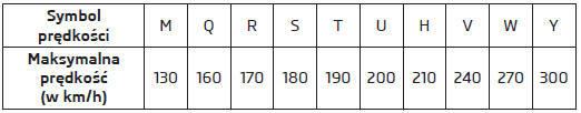 Informacje dotyczące symbolu maksymalnej prędkości jazdy i indeksu obciążenia są podane w dokumentacji samochodu.