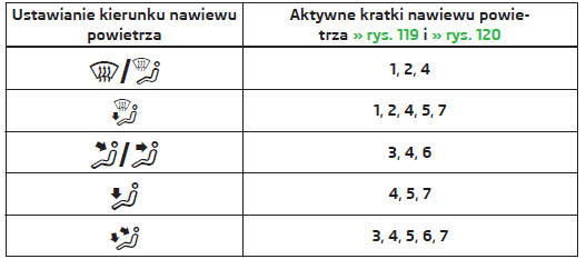 W przypadku kratek nawiewu powietrza 3, 4 rys. 119 i 6 rys. 120 istnieje możliwość zmiany kierunku strumienia powietrza oraz oddzielne zamykanie i otwieranie poszczególnych kratek.